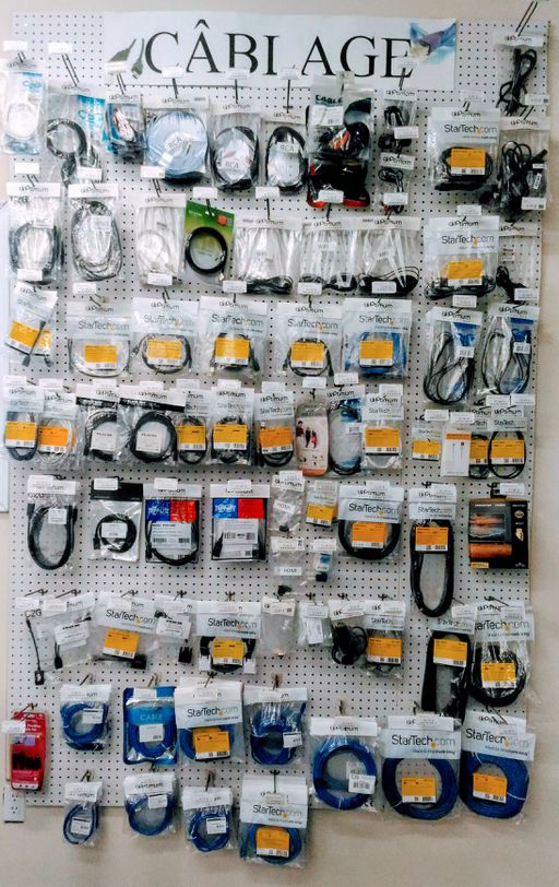 Différents types de câbles et adaptateurs USB, HDMI, DVI, Réseau et plusieurs autres.