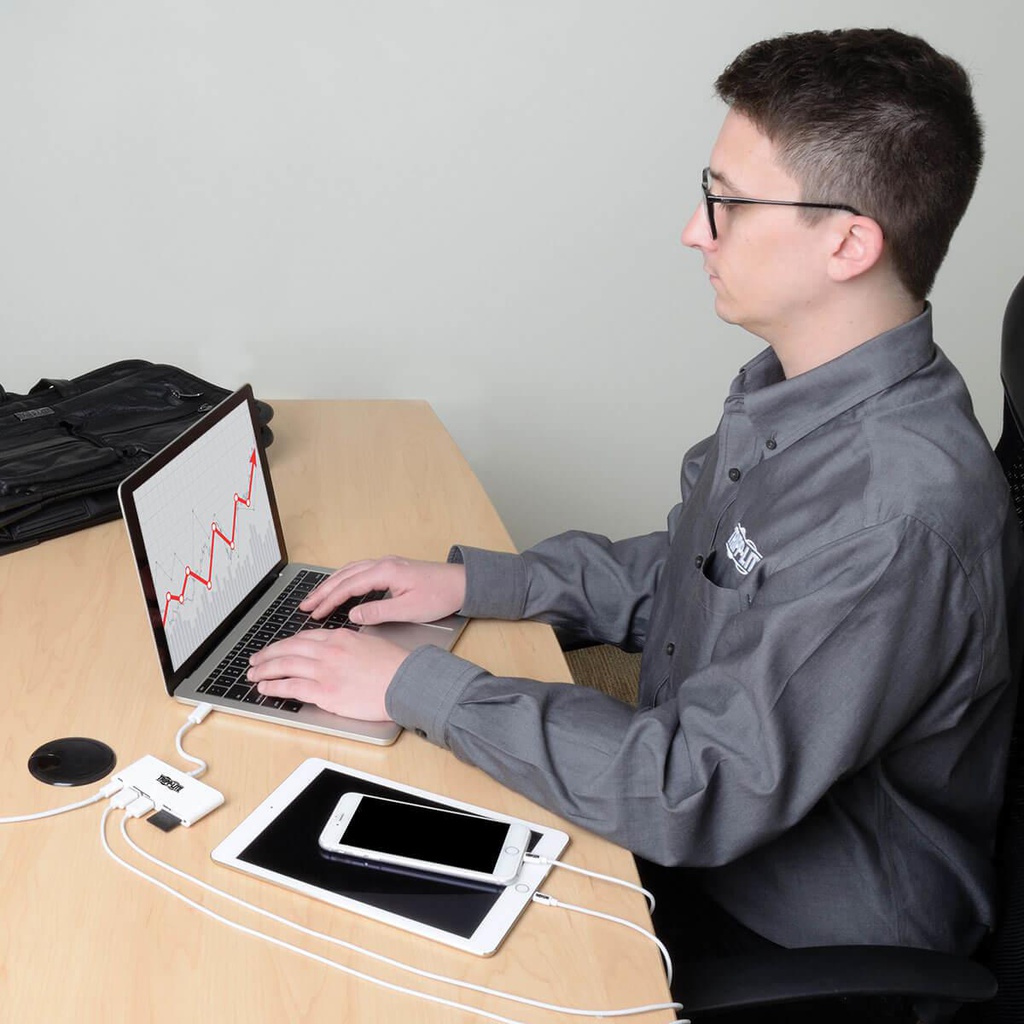The U460-002-2AM-C USB 3.1 Gen 1 USB-C Portable Hub/Adapter expands the potential of your tablet, laptop, Chromebook, MacBook, smartphone or PC’s USB-C or Thunderbolt 3 port. It’s ideal for adding a thumb drive and other USB peripherals, powering and charging a PD Charging-compliant mobile device, and accessing data on a memory card—all at the same time.