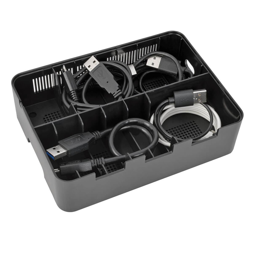 The U280-005-ST features five USB-A ports, each capable of delivering up to 5V, 2.4A, which is enough for charging even battery-intensive devices like the Apple® iPad®. In addition, this charging station doubles as a storage unit by providing space to neatly organize cabling while your devices charge. When not in use, cables can be stored in the compartment and kept out of the way. The included adjustable brackets accommodate the number and size of the devices being charged.